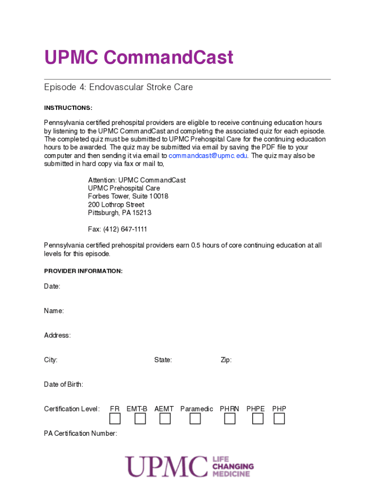 UPMC Commandant Episode 4: Endovascular Stroke Care INSTRUCTIONS:Pennsylvania certified prehospital providers are eligible to receive continuing education hours by listening to the UPMC Commandant