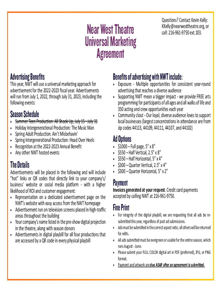 Near West Theater Universal Marketing Agreement Advertising BenefitsThis year, NWT will use a universal marketing approach for advertisement for the 20222023 fiscal year. Advertisements will run from