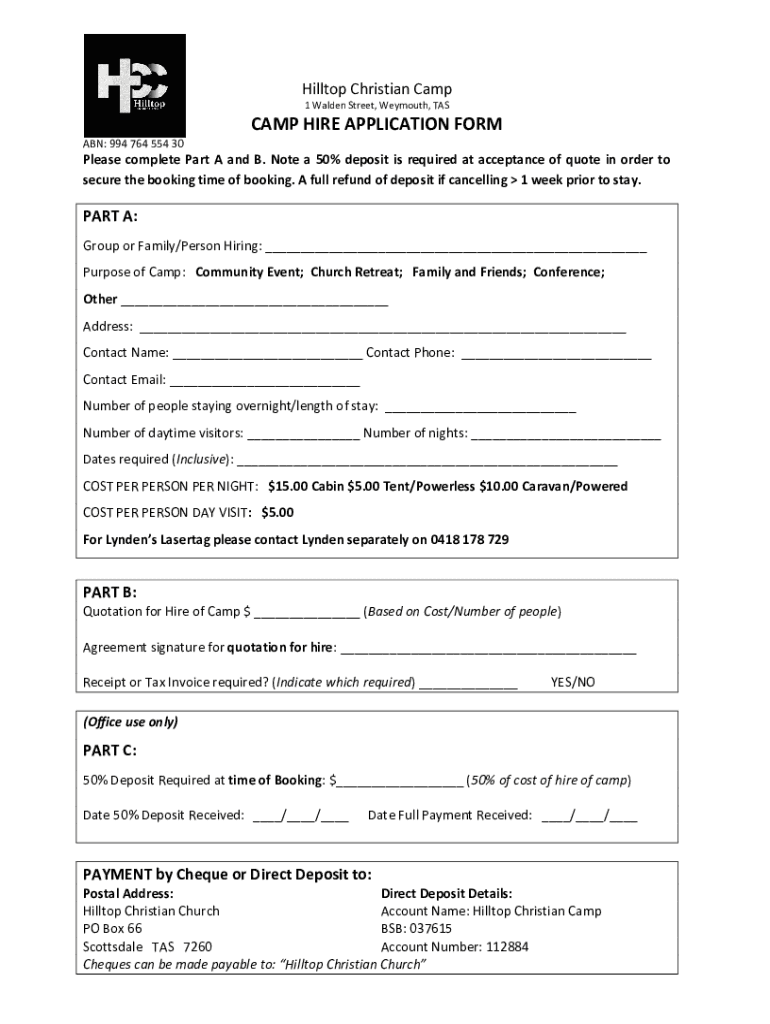 Hilltop Christian Camp 1 Walden Street, Weymouth, SCAMP HIRE APPLICATION FORM ABN: 994 764 554 30Please complete Part A and B. Note a 50% deposit is required at acceptance of quote in order to secure