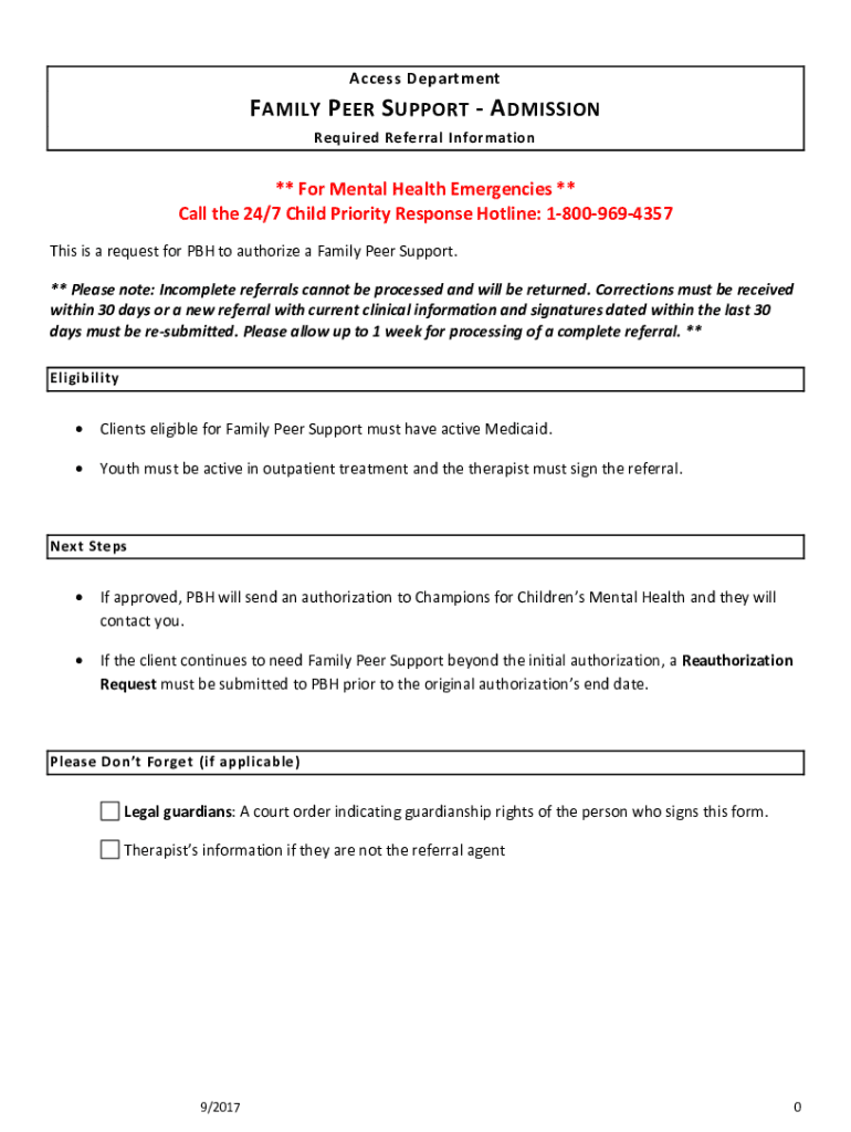 Access Department FAMILY P EER S SUPPORT A MISSION Required Referral Information** For Mental Health Emergencies ** Call the 24/7 Child Priority Response Hotline: 18009694357 This is a request for