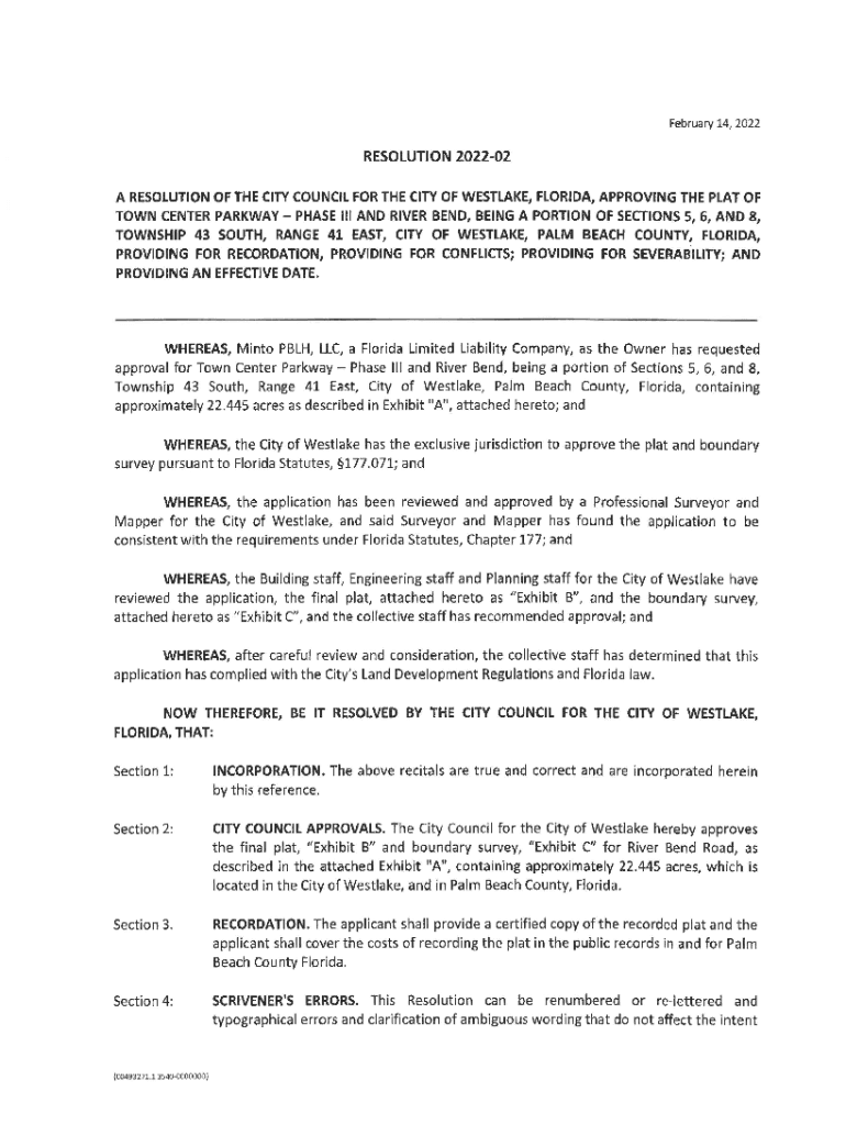 February 14, 2022RESOLUTION 202202 A RESOLUTION OF THE CITY COUNCIL FOR THE CITY OF WESTLAKE, FLORIDA, APPROVING THE PLAT OF TOWN CENTER PARKWAY PHASE Ill AND RIVER BEND, BEING A PORTION OF SECTIONS