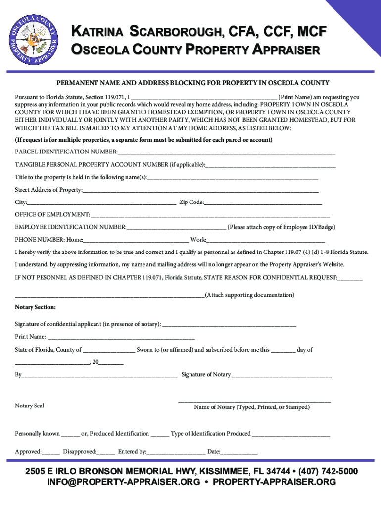KATRINA SCARBOROUGH, CFA, CCF, MCF OSCEOLA COUNTY PROPERTY APPRAISER PERMANENT NAME AND ADDRESS BLOCKING FOR PROPERTY IN OSCEOLA COUNTY Pursuant to Florida Statute, Section 119.071, I ___ (Print Name)