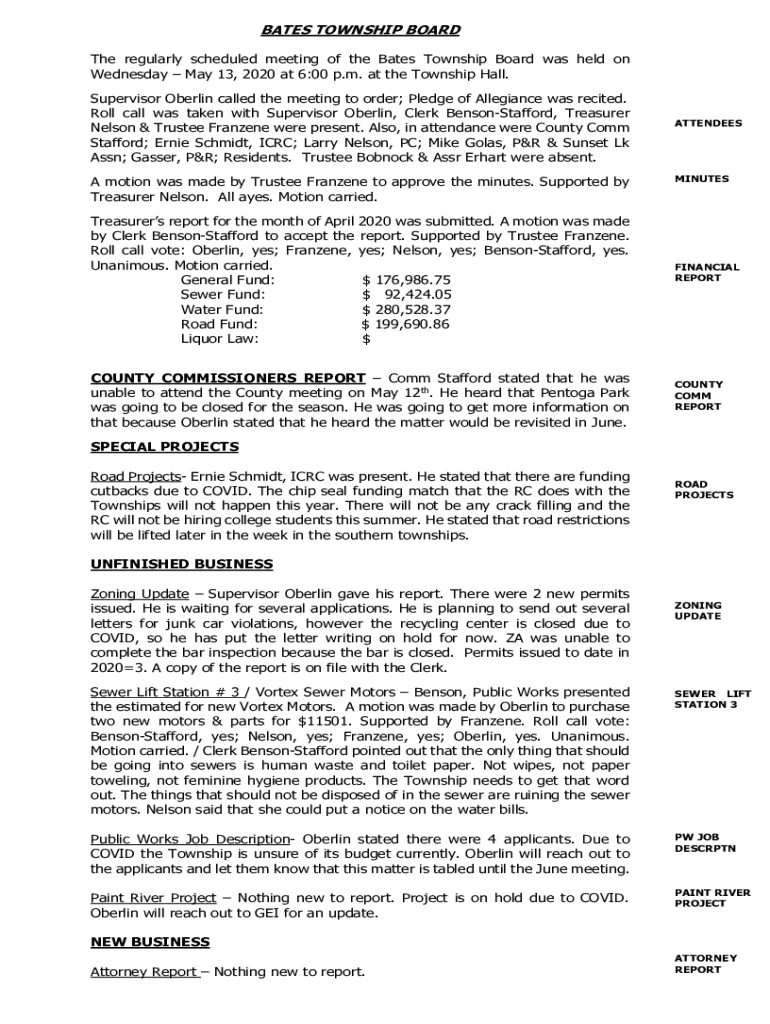 BATES TOWNSHIP BOARD The regularly scheduled meeting of the Bates Township Board was held on Wednesday, May 13, 2020, at 6:00 p.m. at the Township Hall. Supervisor Oberlin called the meeting to order;