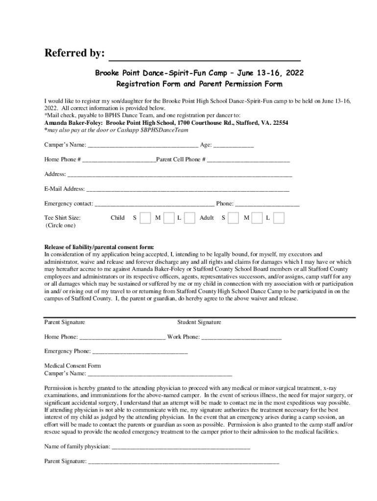 BROOKE POINT Dance Spirit Fun Camp When:13 16 June 2022Where:Brooke Point High School GymnasiumTime:6:00 8:00 pm each evening:$40 for the week *includes tee shirt $35 for each additional siblings:3