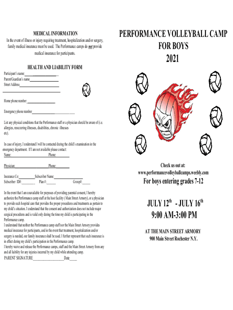 MEDICAL INFORMATION In the event of illness or injury requiring treatment, hospitalization and/or surgery, family medical insurance must be used. The Performance camps do not provide medical insurance