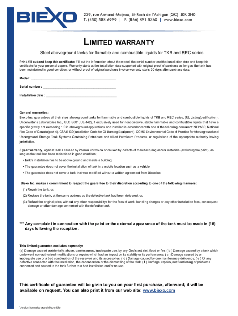239, rue ArmandMajeau, Strong de Michigan (QC) J0K 3H0 T. (450) 5886999 | F. (866) 8915360 | www.biexo.comLIMITED WARRANTY Steel above ground tanks for flammable and combustible liquids for KB and