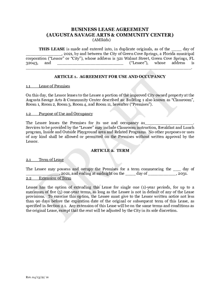 BUSINESS LEASE AGREEMENT (AUGUSTA SAVAGE ARTS & COMMUNITY CENTER) (Aikido) THIS LEASE is made and entered into, in duplicate originals, as of the ___ day of ___, 2021, by and between the City of Green