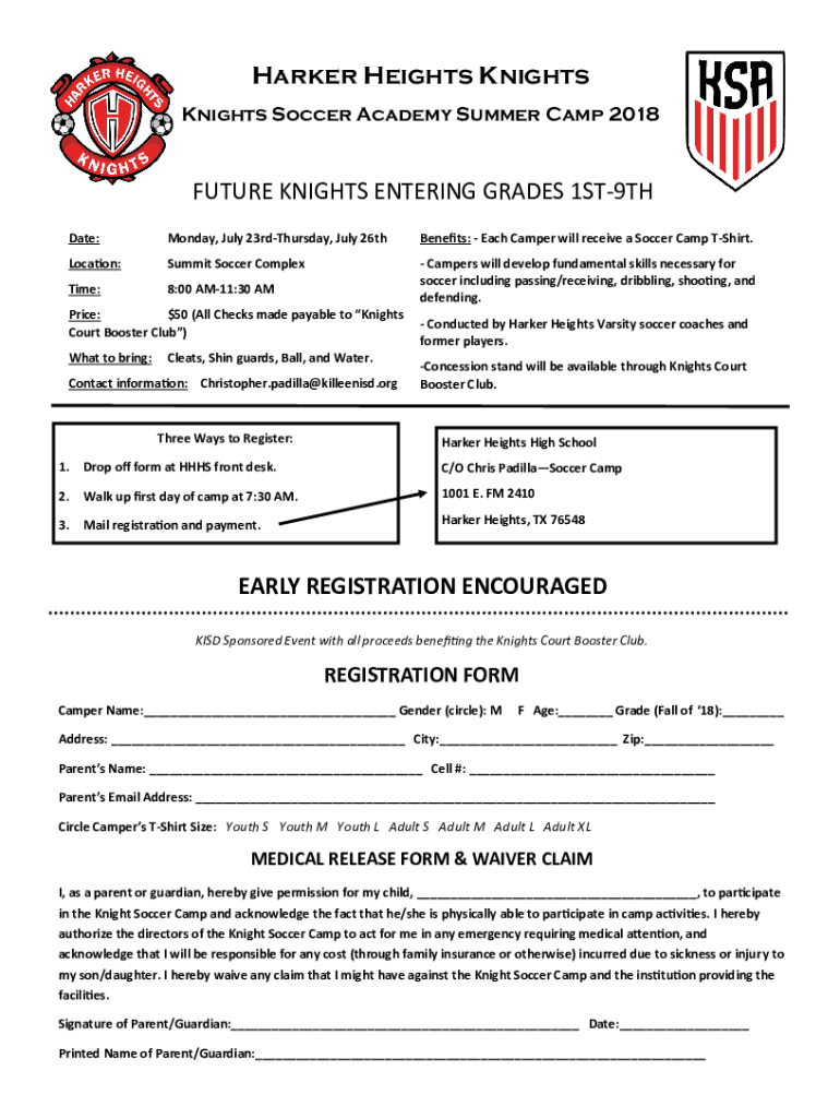 Parker Heights Knights Soccer Academy Summer Camp 2018FUTURE KNIGHTS ENTERING GRADES 1ST9TH Date:Monday, July 23rdThursday, July 26thBenefits: Each Camper will receive a Soccer Camp Shirt. Location:Summit