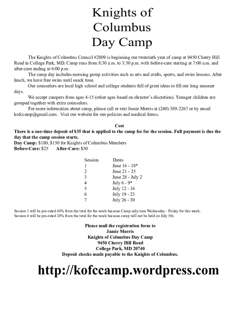 The Knights of Columbus Council #2809 is beginning our twentieth year of camp at 9450 Cherry Hill Road in College Park, MD. Camp runs from 8:30 a.m. to 3:30 p.m. with before care starting at 7:00