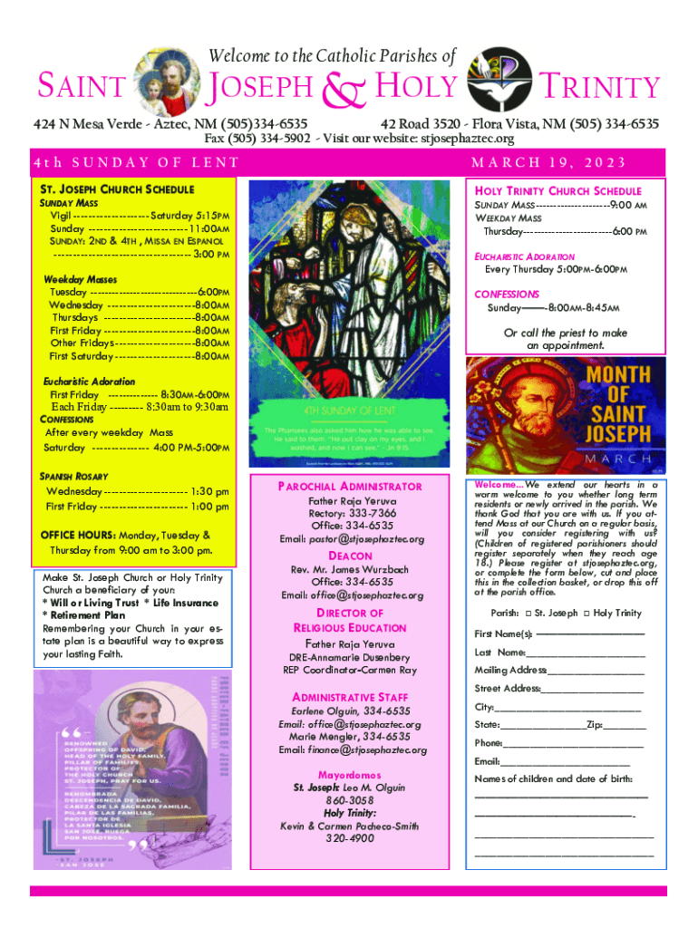 SAINTWelcome to the Catholic Parishes Joseph & HOLY424 N Mesa Verde Aztec, NM (505)3346535TRINITY42 Road 3520 Flora Vista, NM (505) 3346535Fax (505) 3345902 Visit our website: stjosephaztec.org4th