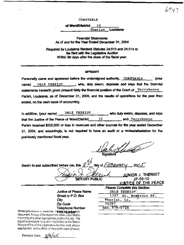 CONSTABLE 10 of Ward/District TheriotLouisianaFinancial Statements As of and for the Year Ended December 31, 2004, Required by Louisiana Revised Statutes 24:513 and 24:514 to Be filed with the Legislative