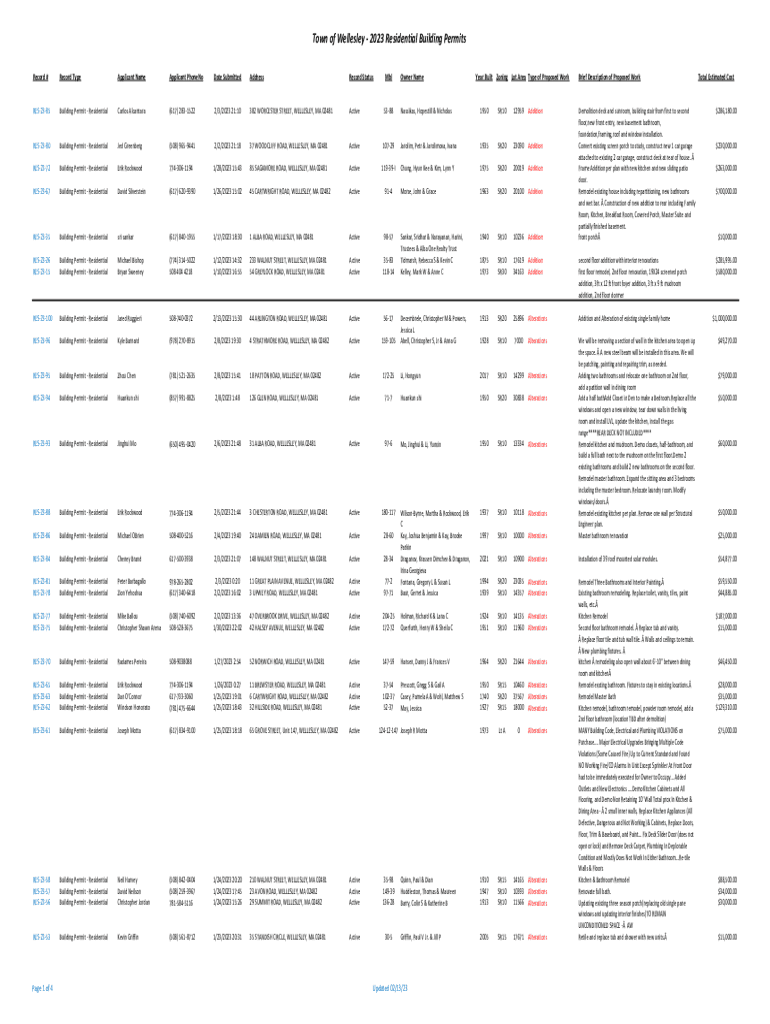 Town of Wellesley 2023 Residential Building Permits Record #Record TypeApplicant NameApplicant PhoneNoDate SubmittedAddressRecord StatusMblRES2385Building Permit Residential Carlos Alcántara(617)