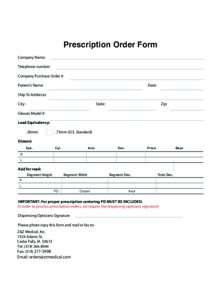 Prescription Order Form Company Name: Telephone number: Company Purchase Order #: Patients Name:Date:Ship To Address’t City:State:Zip:Glasses Model #: Lead Equivalency: .50 mm.75 mm (U.S. Standard)Distant: