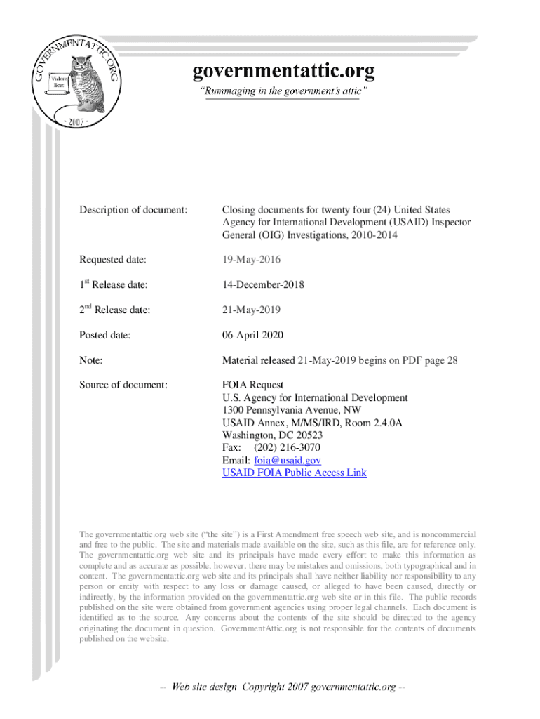 Description of document:Closing documents for twenty-four (24) United States Agency for International Development (USAID) Inspector General (OIL) Investigations, 20102014Requested date:19May20161st