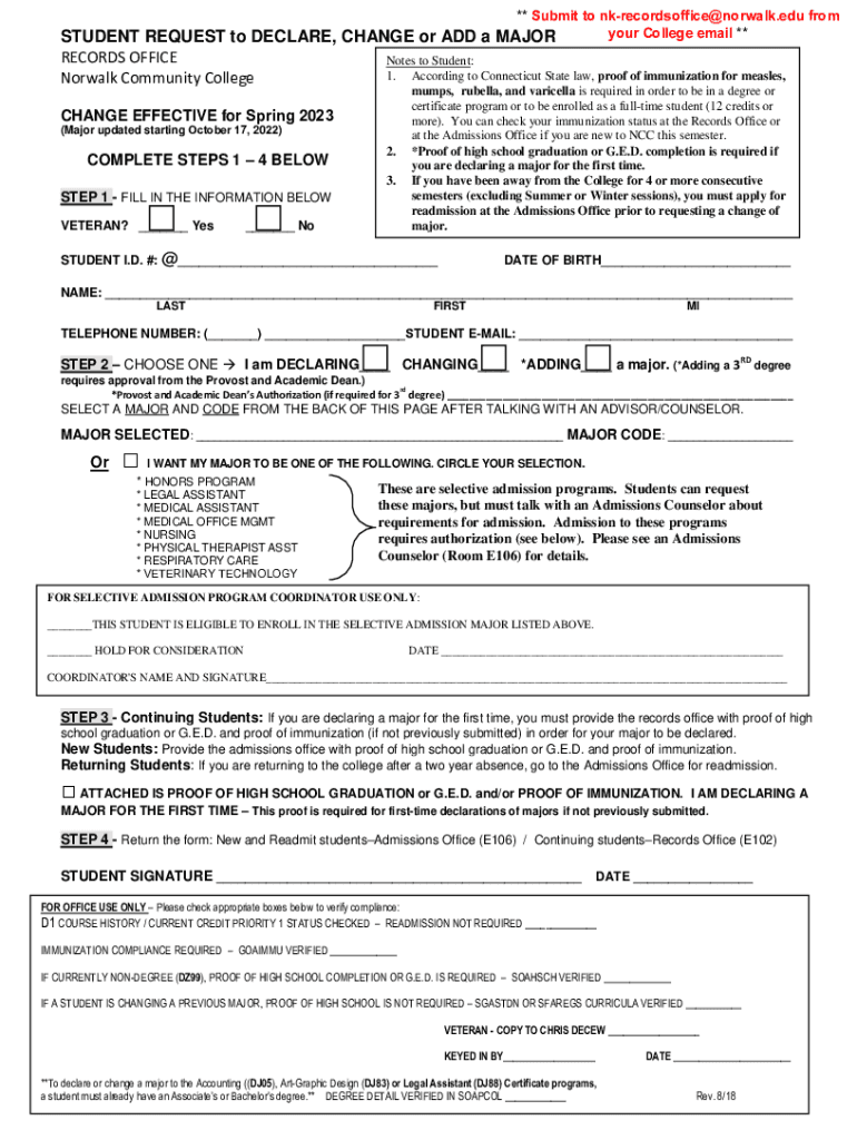 ** Submit to nkrecordsoffice@norwalk.edu from your College email ** MAJORSTUDENT REQUEST to DECLARE, CHANGE or ADD a RECORDS OFFICE Notes to Student: 1. According to Connecticut State law, proof of