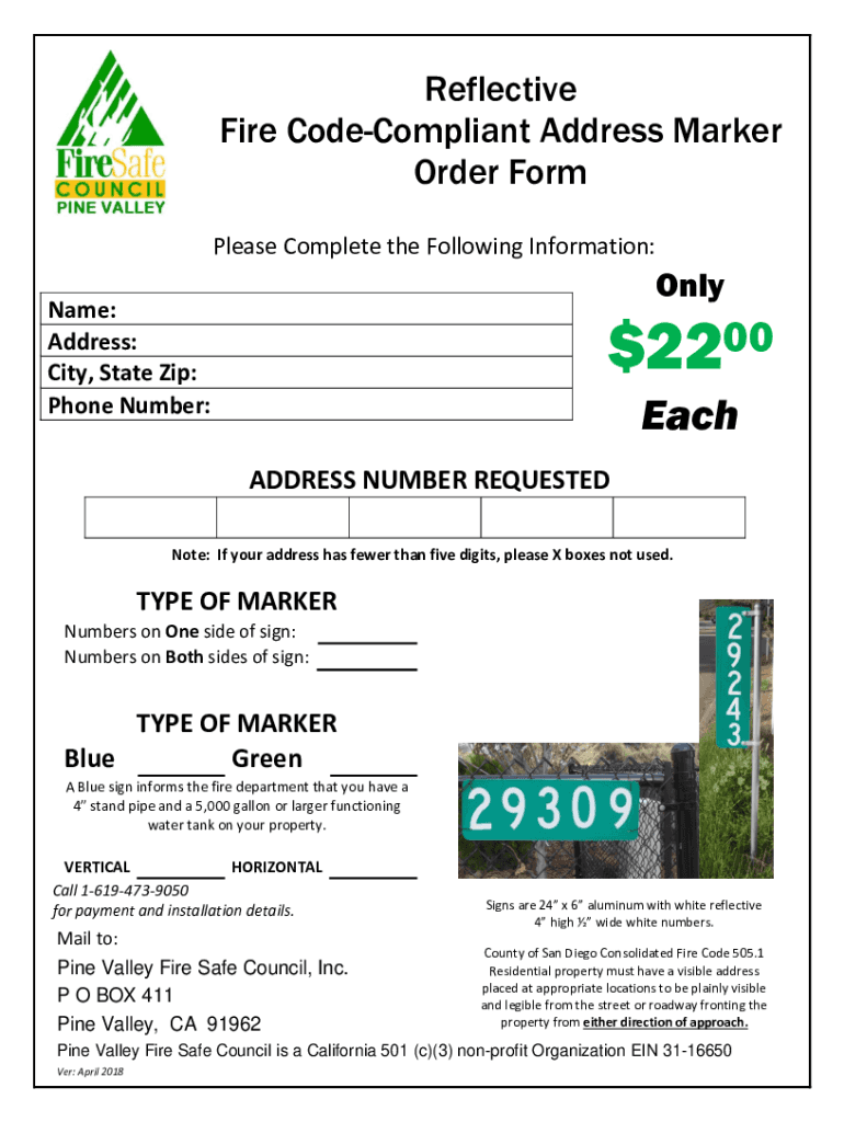 Reflective Fire Non-compliant Address Marker Order Form Please Complete the Following Information:Online: Address: City, State Zip: Phone Number:$2200 Each ADDRESS NUMBER REQUESTEDNote: If your address