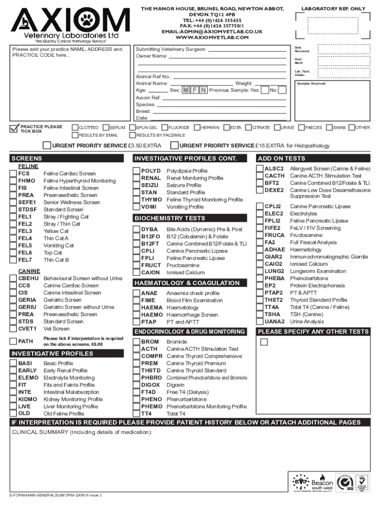 THE MANOR HOUSE, BRUNEI ROAD, NEWTON ABBOT, DEVON.TQ12 4 PB TEL: +44 (0)1626 355655 Faxes: +44 (0)1626 357750/1 EMAIL: ADMIN@AXIOMVETLAB.CO.UK WWW.AXIOMVETLAB.COM Please add your practice NAME, ADDRESS