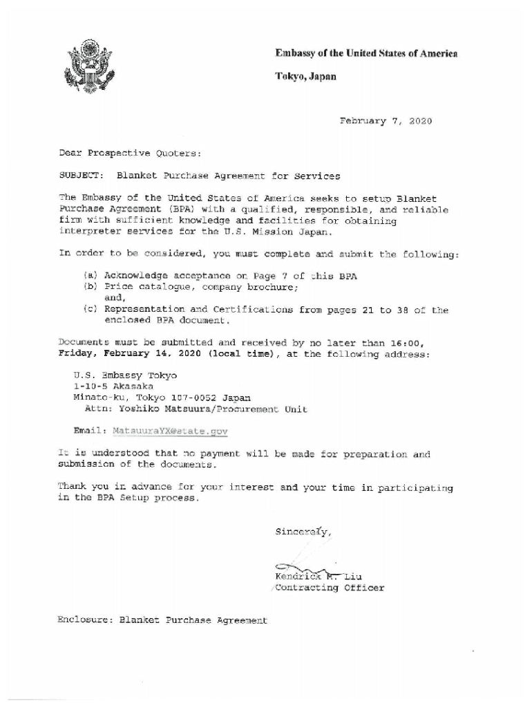 Blanket Purchase Agreement Page 1 of 38SECTION 1 THE SCHEDULE BLANKET PURCHASE AGREEMENT (BPA) No. [To Be Determined] ESTABLISHED BETWEEN US EMBASSY TOKYO AND THE BPA HOLDER: [To Be Determined]1.