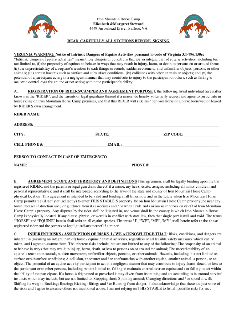 Iron Mountain Horse Camp Elizabeth Margaret Steward 4449 Arrowhead Drive, Ivanhoe, VA READ CAREFULLY ALL SECTIONS BEFORE SIGNINGVIRGINIA WARNING: Notice of Intrinsic Dangers of Equine Activities pursuant