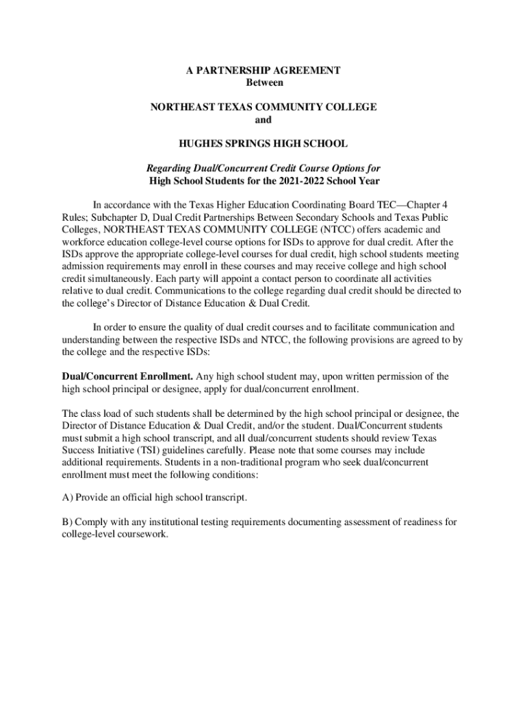 A PARTNERSHIP AGREEMENT Between NORTHEAST TEXAS COMMUNITY COLLEGE and HUGHES SPRINGS HIGH SCHOOL Regarding Dual/Concurrent Credit Course Options for High School Students for the 20212022 School Year