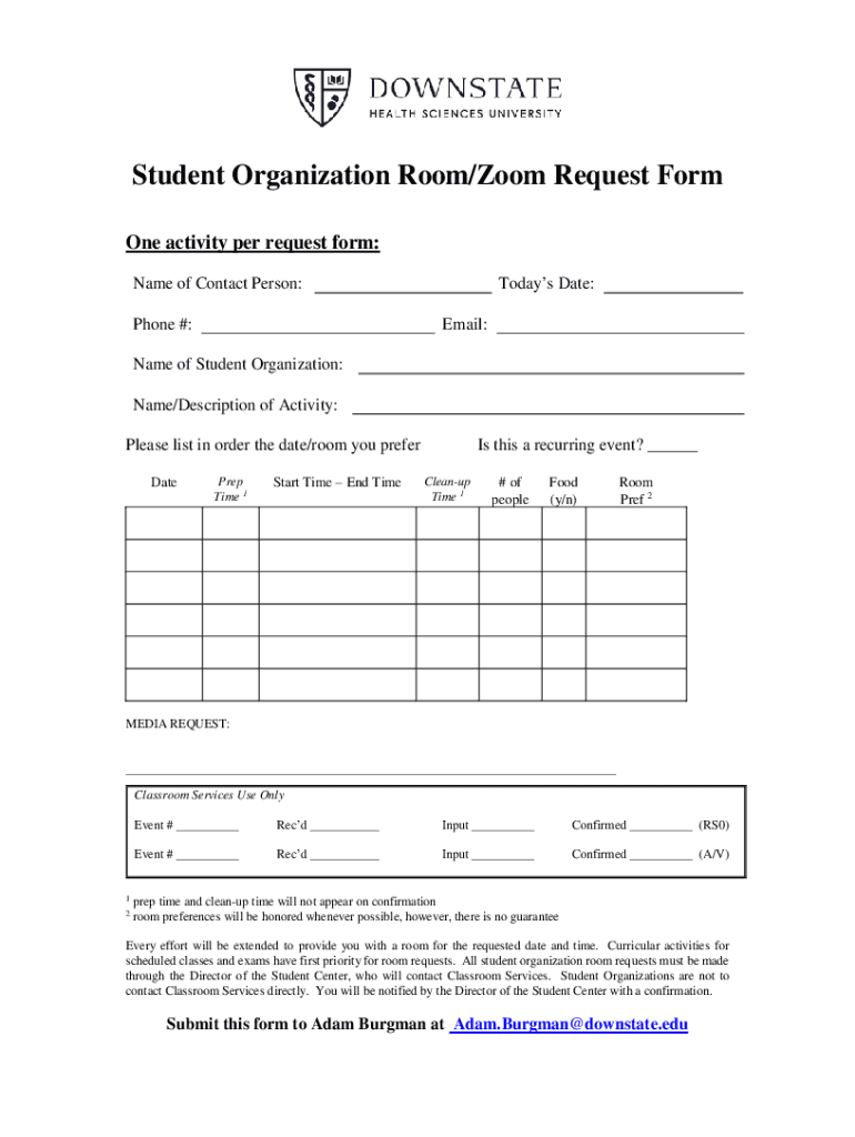 Student Organization Room/Zoom Request Form One activity per request form: Name of Contact Person: Phone #:Today's Date: Email:Name of Student Organization: Name/Description of Activity: Please list