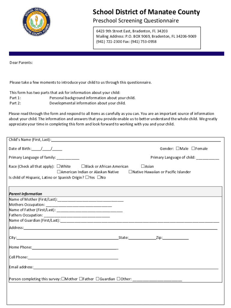 School District of Manatee County Preschool Screening Questionnaire6423 9th Street East, Bradenton, Fl. 34203 Mailing Address: P.O. BOX 9069, Bradenton, FL 342069069 (941) 7212300 Fax: (941) 7530958Dear
