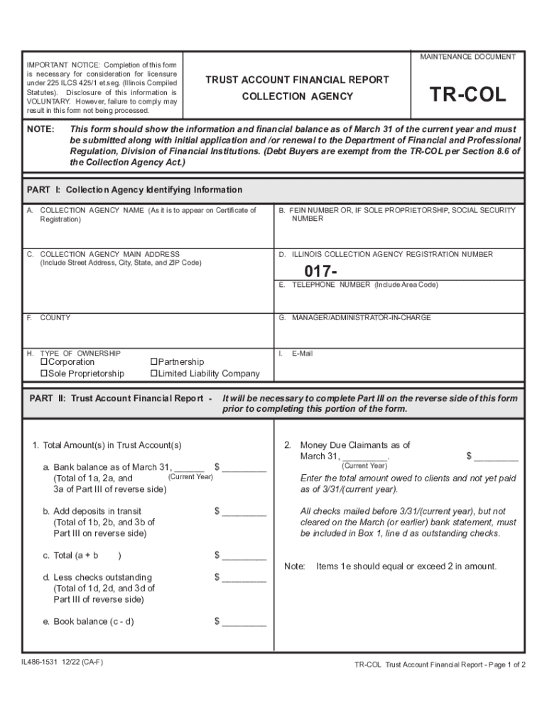 Get the free TR-COL Form - Illinois Department of Financial and ...