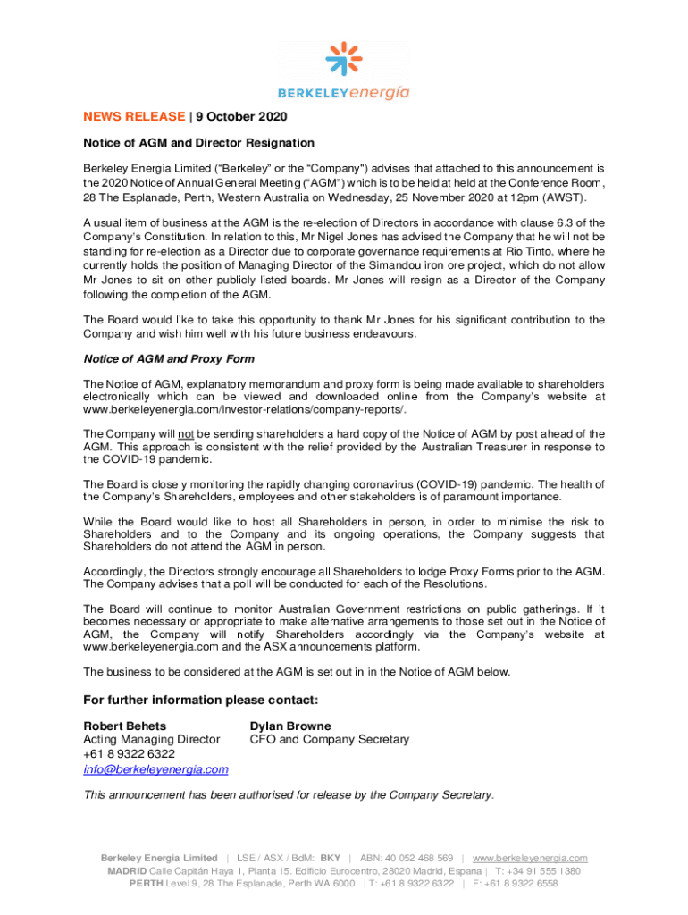 NEWS RELEASE | 9 October 2020 Notice of AGM and Director Resignation Berkeley Energy Limited (Berkeley or the Company\”) advises that attached to this announcement is the 2020 Notice of Annual General