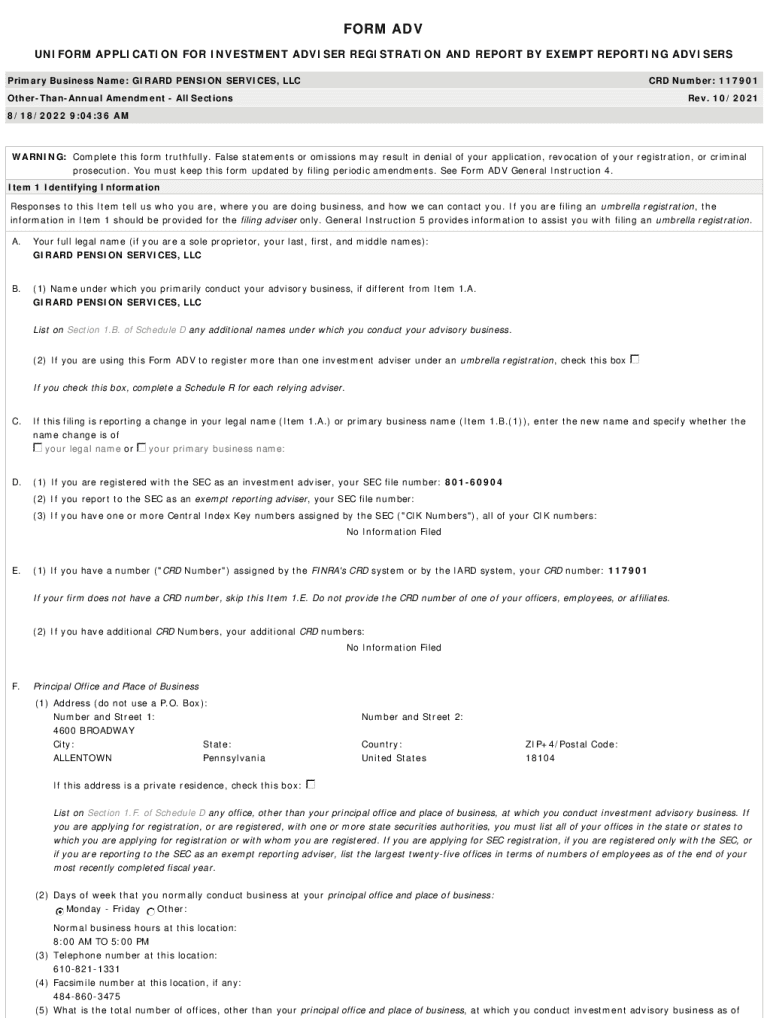 FORM ADV UNIFORM APPLICATION FOR INVESTMENT ADVISER REGISTRATION AND REPORT BY EXEMPT REPORTING ADVISERS Primary Business Name: GIRARD PENSION SERVICES, LLC CRD Number: 117901OtherThanAnnual Amendment
