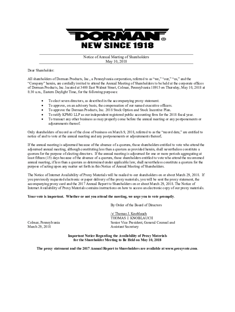 Notice of Annual Meeting of Shareholders May 10, 2018, Dear Shareholder: All shareholders of Norman Products, Inc., a Pennsylvania corporation, referred to as we, our, us, and the Company herein,