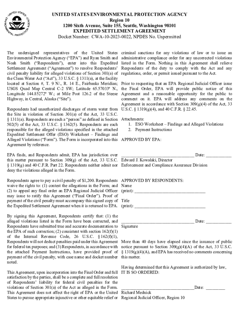 UNITED STATES ENVIRONMENTAL PROTECTION AGENCY Region 10 1200 Sixth Avenue, Suite 155, Seattle, Washington 98101 EXPEDITED SETTLEMENT AGREEMENT Docket Number: CWA1020230022, NODES No. Permitted The