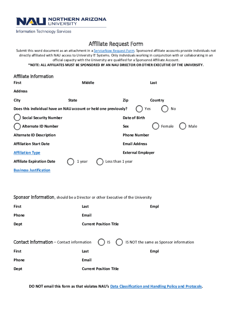 Affiliate Request Form Submit this word document as an attachment in a ServiceNow Request Form. Sponsored affiliate accounts provide individuals not directly affiliated with NAU access to University