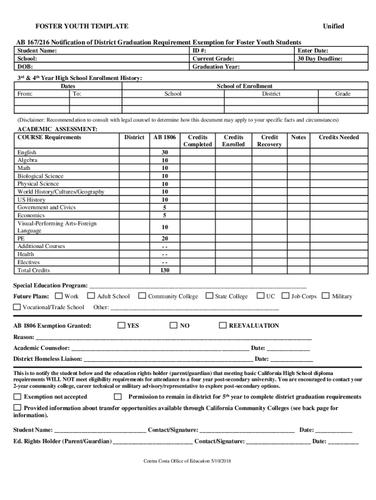 FOSTER YOUTH TEMPLATEUnifiedAB 167/216 Notification of District Graduation Requirement Exemption for Foster Youth Students Student Name: School: DOB:ID #: Current Grade: Graduation Year:3rd & 4th