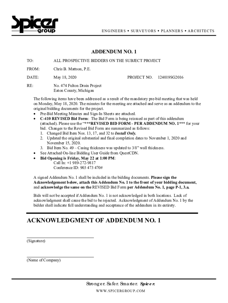 EN GINGERS SURVEY ORS PLAN ERS A R CH I T E CTS ADDENDUM NO. 1 TO:ALL PROSPECTIVE BIDDERS ON THE SUBJECT PROJECTION:Chris B. Matt son, P.E.DATE:May 18, 2020RE:No. 474 Fulton Drain Project Eaton County,