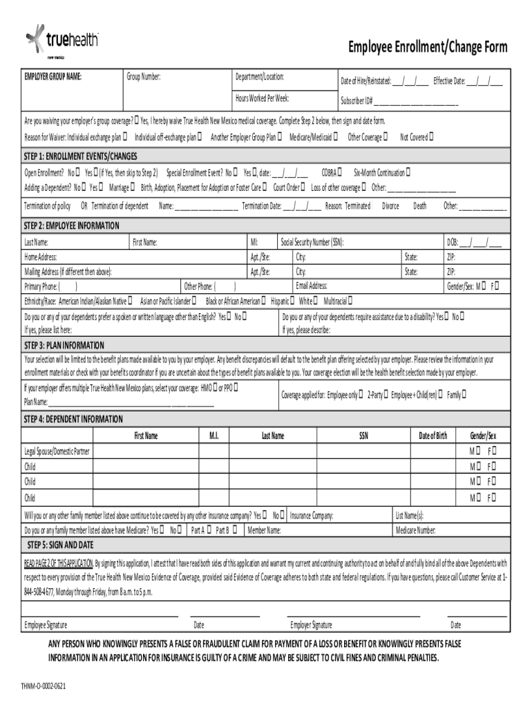 Employee Enrollment/Change Form EMPLOYER GROUP NAME:Group Number:Department/Location:Date of Hire/Reinstated: ___/___/___ Effective Date: ___/___/___Hours Worked Per Week:Subscriber ID# ___Are you