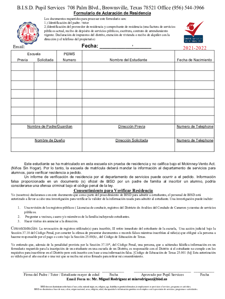 Todos los padres, tutores o responsables legales de los estudiantes matriculados en las escuelas del distrito deben presentar brownsville independent school district.