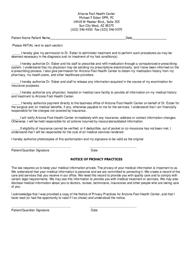 Arizona Foot Health Center Michael F Ester PM, PC 14418 W Meeker Blvd., Suite 205 Sun City West, AZ 85375 (623) 5464930 Fax (623) 5465979 Patient Name___Date___ Please INITIAL next to each section: