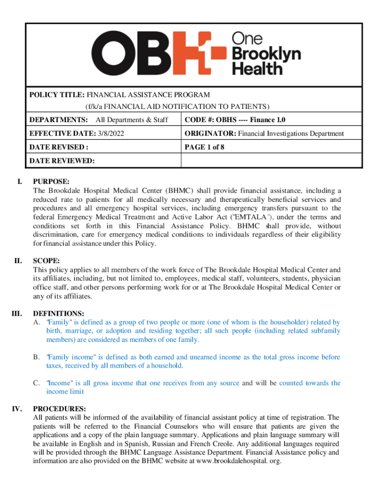 POLICY TITLE: FINANCIAL ASSISTANCE PROGRAM (f/k/a FINANCIAL AID NOTIFICATION TO PATIENTS) DEPARTMENTS:All Departments & Staffed #: OBIS Finance 1.0EFFECTIVE DATE: 3/8/2022ORIGINATOR: Financial Investigations