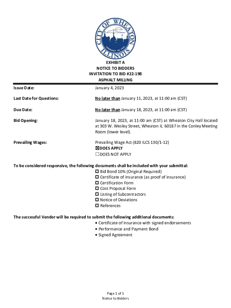EXHIBIT A NOTICE TO BIDDERS INVITATION TO BID #22198 ASPHALT MILLING Issue Date:January 4, 2023Last Date for Questions:No later than January 11, 2023, at 11:00 am (CST)Due Date:No later than January