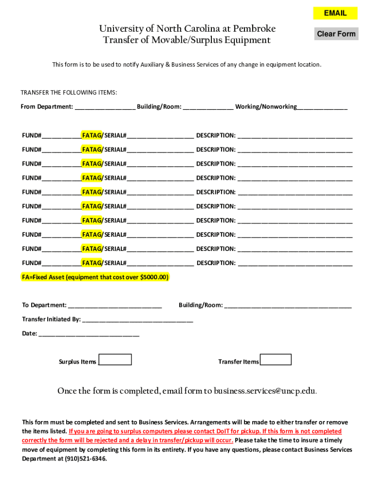Transfer of Movable/Surplus EquipmentClear Forms form is to be used to notify Auxiliary & Business Services of any change in equipment location. TRANSFER