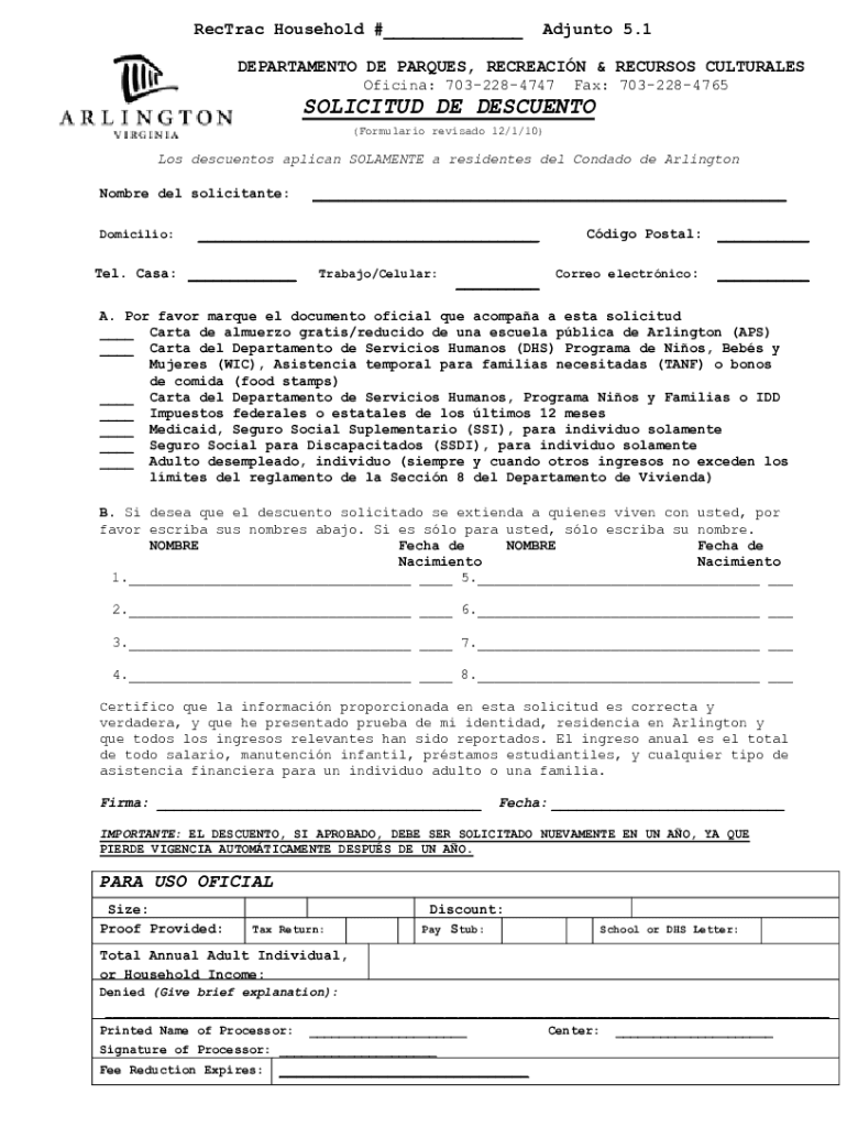 Retract Household #___Adj unto 5.1DEPARTAMENTO DE MARQUES, RECREATION & RECUR SOS CULTURAL ES Official: 7032284747Fax: 7032284765SOLICITUD DE DESCENT (Formulation revised 12/1/10)Los descents African
