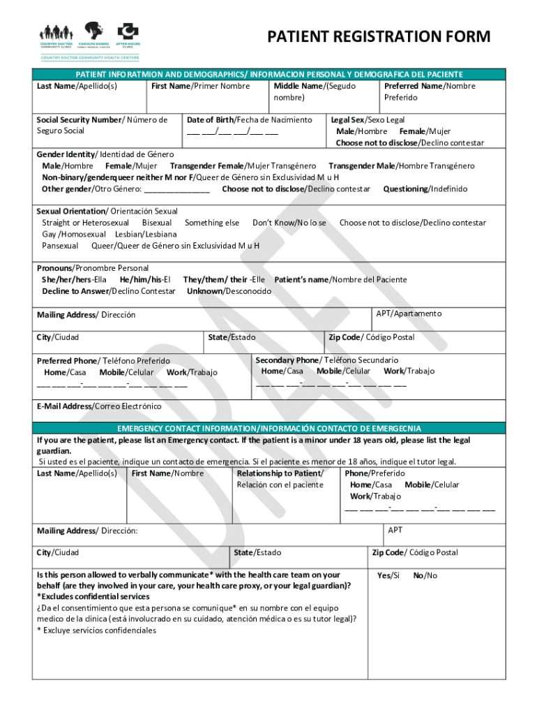 PATIENT REGISTRATION FORM PATIENT INFORMATION AND DEMOGRAPHICS/ INFORMATION PERSONAL Y DEMOCRATIC DEL PATIENTS Last Name/Adelaide(s) First Name/Primer Hombre Middle Name/(Segundo Preferred Name/Hombre)