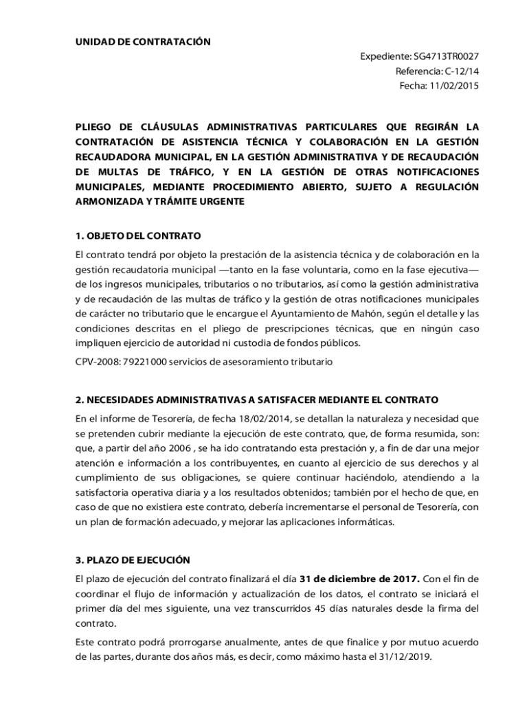 UNITED DE CONTRATACIN Expedient: SG4713TR0027 Reference: C12/14 Tech: 11/02/2015PLIEGO DE CLUSTERS ADMINISTRATIVE PARTICULARS QUE REGION LA CONTRATACIN DE ASISTENCIA TCN ICA Y COLLABORATION EN LA