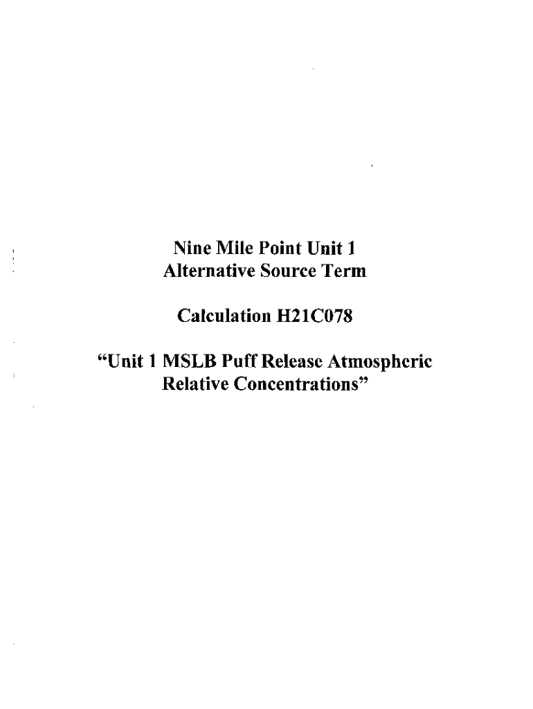 Nine Mile Point Unit 1 Alternative Source Term Calculation H21C078 \” Unit 1 MSB Puff Release Atmospheric Relative Concentrations\” Originator(s)., .4,ANTHONY G.LAURA (SARGENT & LUNDY)/reviewer(s)/Approver(s)