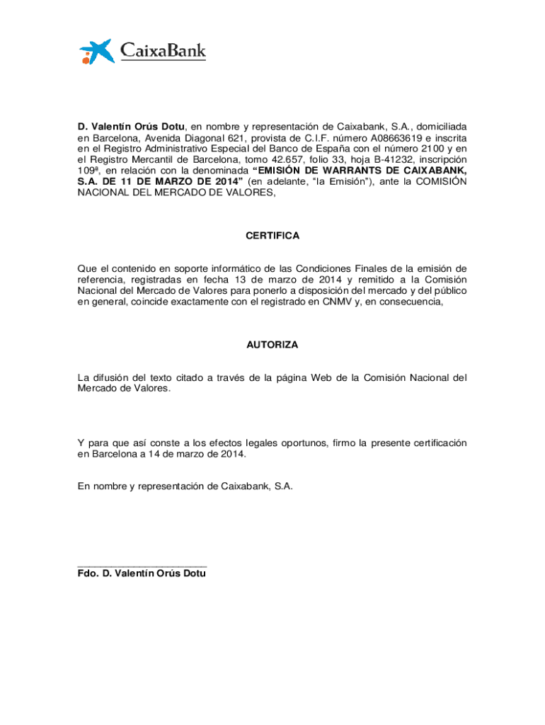 D. Valentin ORS Dot, en hombre y representation de CaixaBank, S.A., domiciliary en Barcelona, Agenda Diagonal 621, pro vista de C.I.F. Nero A08663619 e inscribe en El Registry Administrative Especial