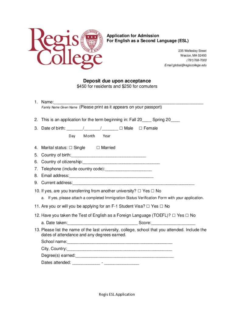 Application for Admission For English as a Second Language (ESL) 235 Wellesley Street Weston, MA 02493 (781)7687000 Email:global@regiscollege.deposit due upon acceptance $450 for residents and $250