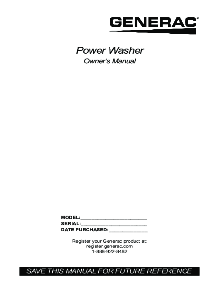 Power Washer Owners Manual009045MODEL:___ SERIAL:___ DATE PURCHASED:___ Register your General product at: register.generac.com 18889228482SAVE THIS MANUAL FOR FUTURE REFERENCETable of Contents Section