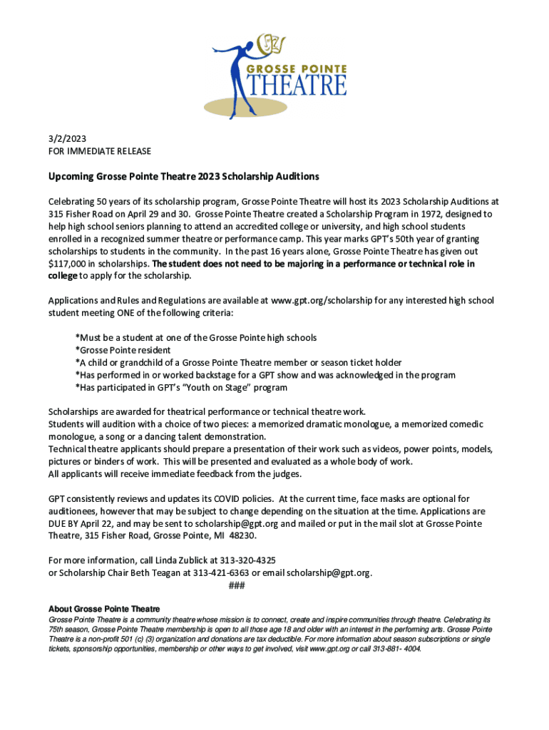 FOR IMMEDIATE RELEASEUpcoming Gross Point Theater 2023 Scholarship Auditions