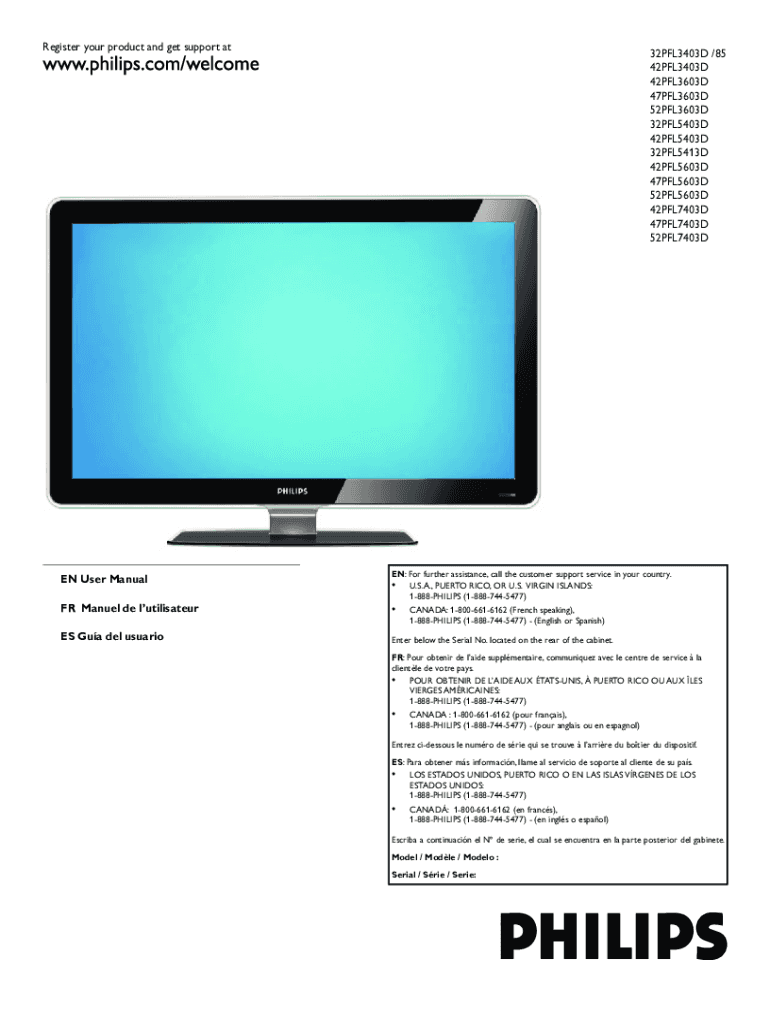Register your product and get support ten User Manual FR Manuel de lutilisateur ES GUA Del usuario32PFL3403D /85 42PFL3403D 42PFL3603D 47PFL3603D 52PFL3603D 32PFL5403D 42PFL5403D 32PFL5413D 42PFL5603D
