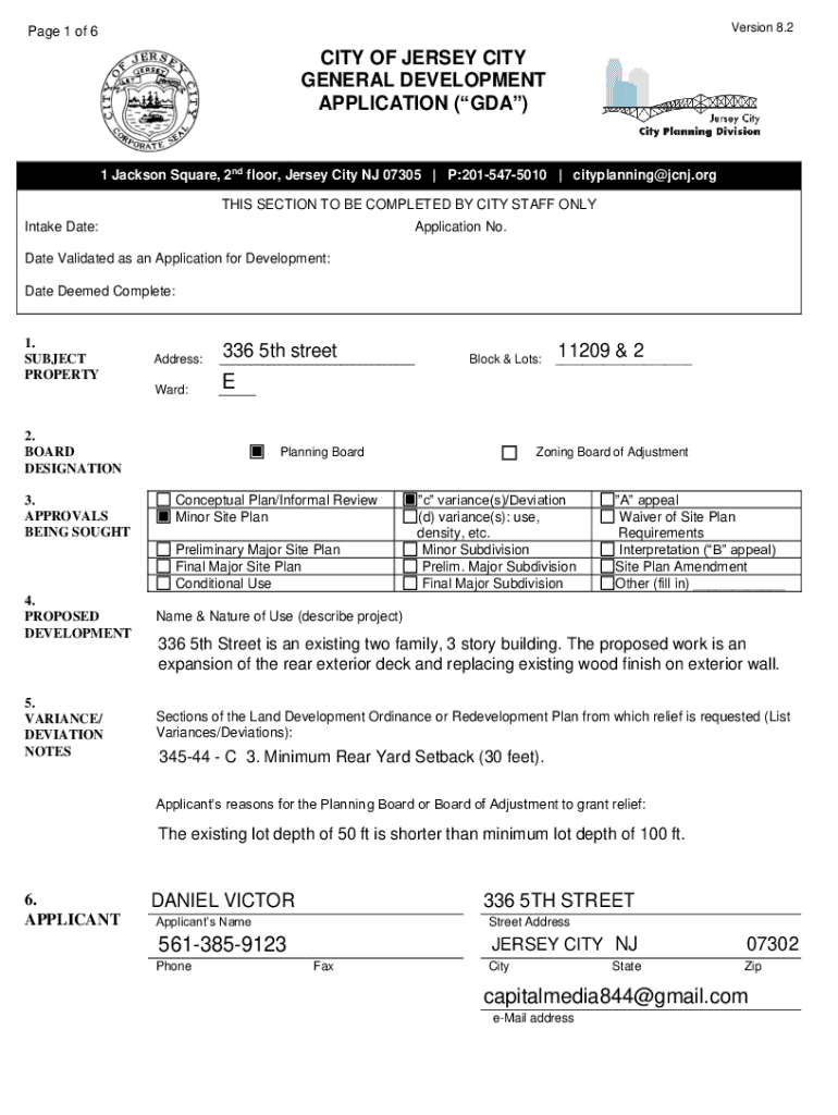Version 8.2Page 1 of 6CITY OF JERSEY CITY GENERAL DEVELOPMENT APPLICATION (GDP)1 Jackson Square, 2nd floor, Jersey City NJ 07305 | P:2015475010 | cityplanning@jcnj.org THIS SECTION TO BE COMPLETED